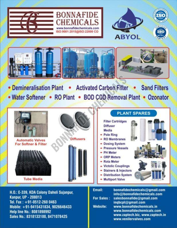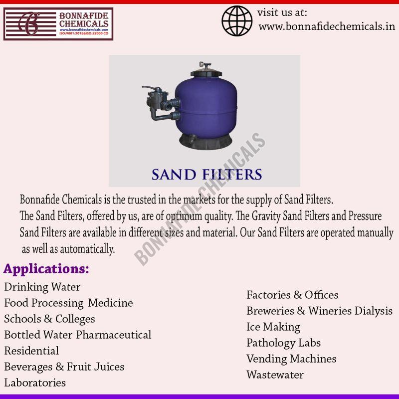 BONNAFIDE CHEMICALS Sand filter specifications include material (FRP, Mild Steel, Stainless Steel), vessel dimensions (e.g., with specific details varying by application, such as pool filters, industrial filters, or slow sand filters).